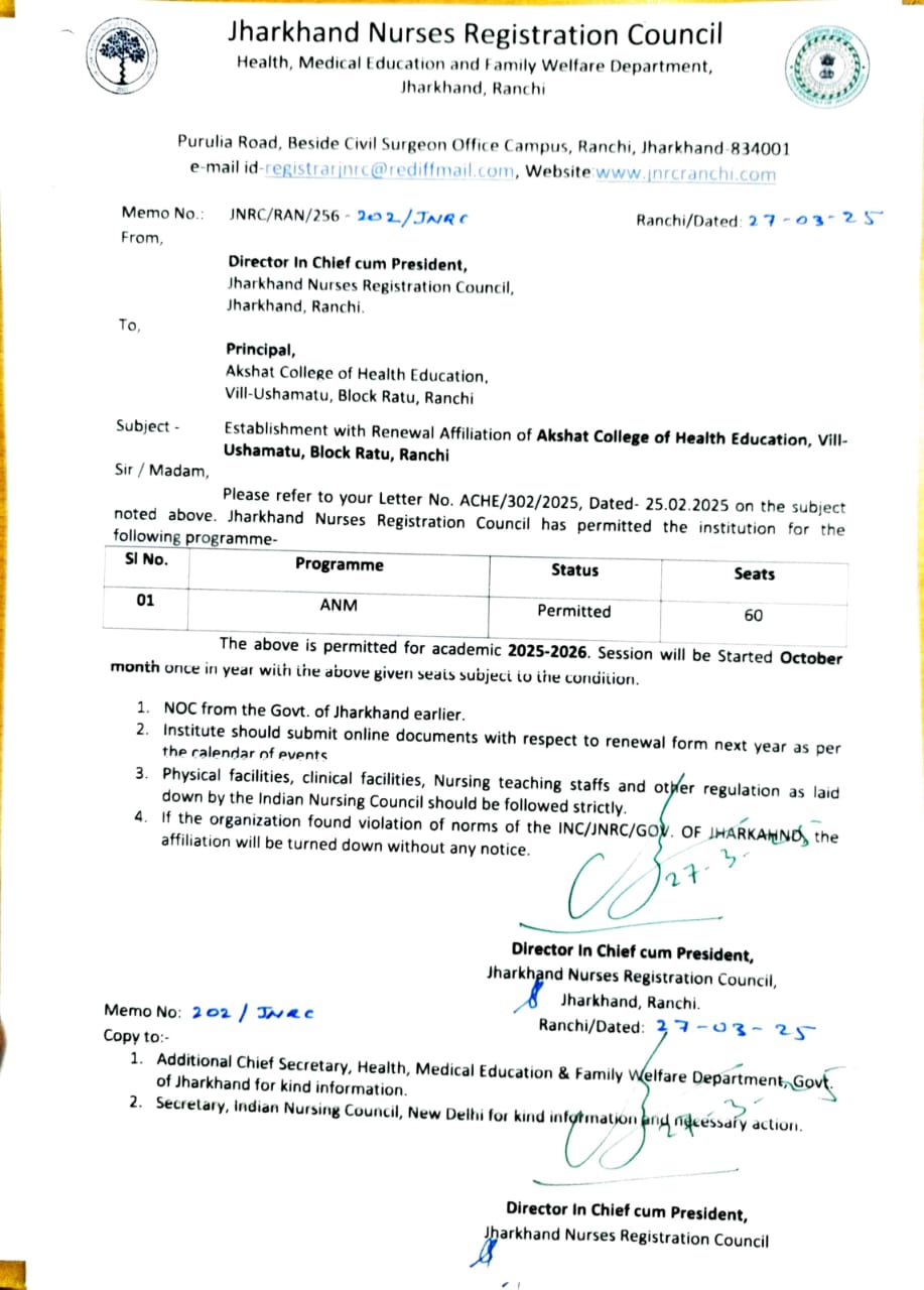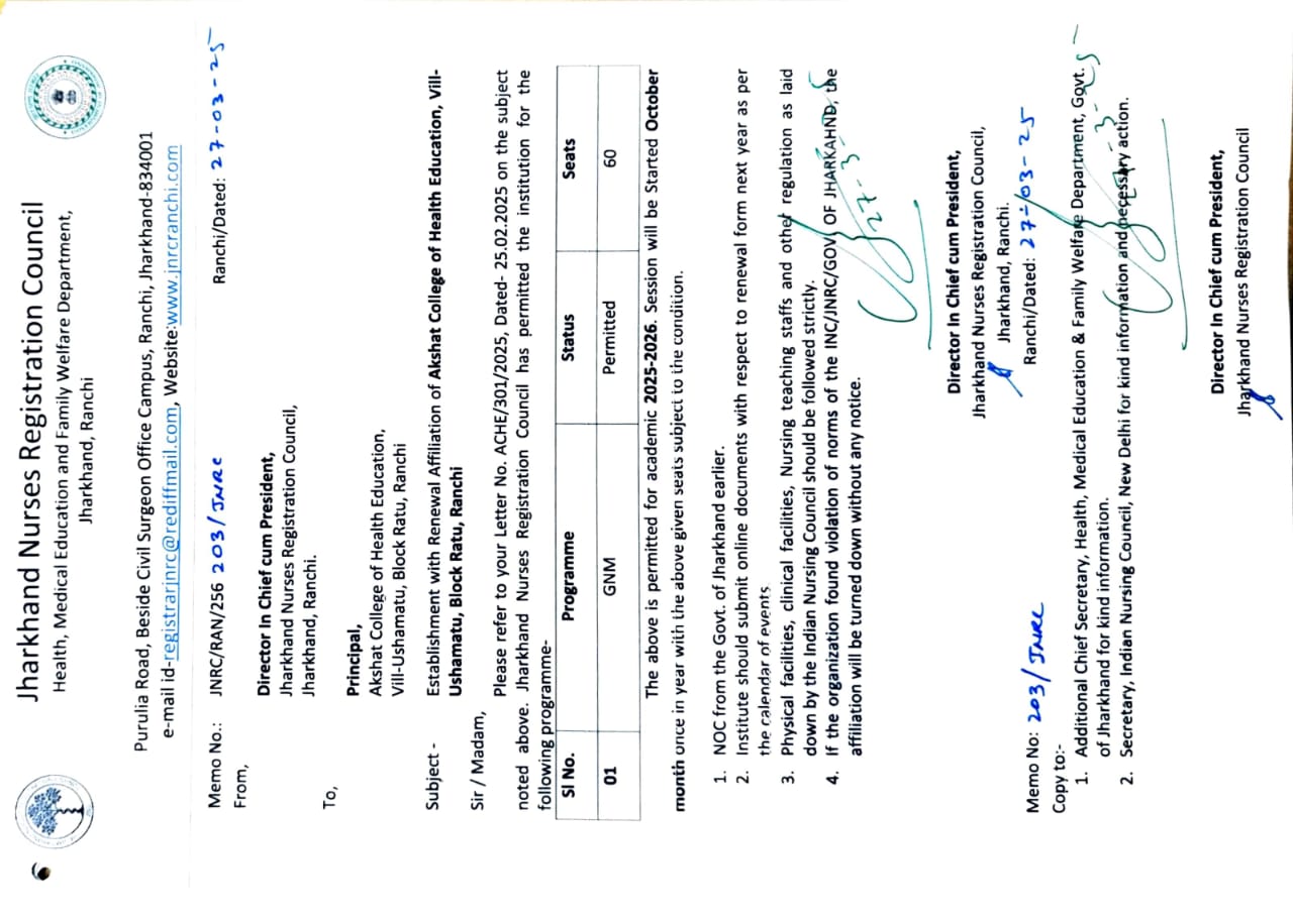 Akshat College of Health Education (ACHE) is fully committed to maintaining the highest standards of professional education. Our Nursing and Pharmacy programs are duly approved by the respective national and state regulatory bodies. Below are the official affiliation and approval documents for public verification.